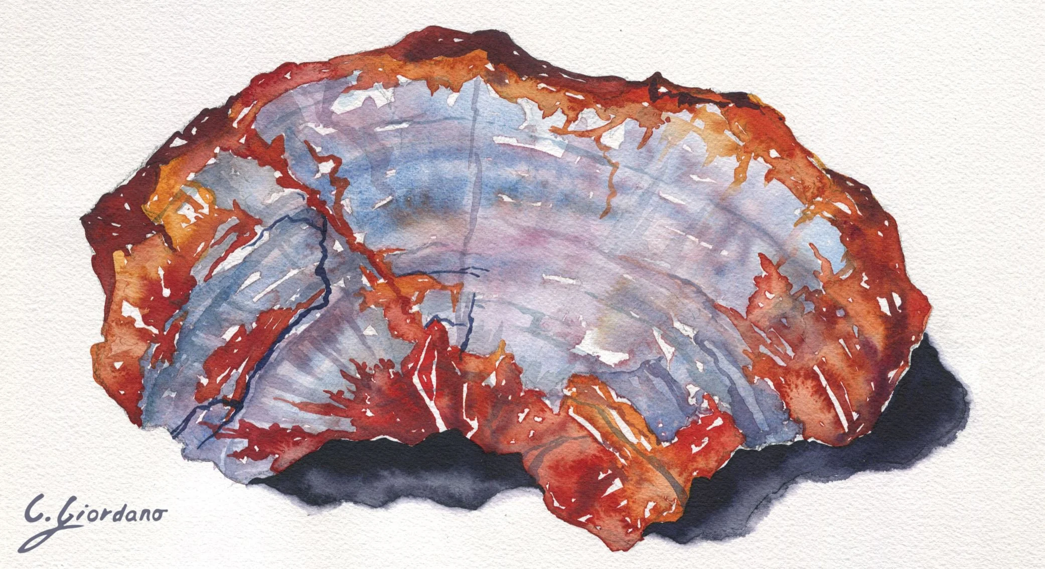 Indanthrone blue- the absolutely perfect base color for the shadows and darkest cracks in the stone. In every painting I made the shadow by combining Indanthrone blue with usually at least two colors from the rest of the petrified wood, as this helped the shadow harmonize with the rest of the painting, and also made each painting have a unique shadow color.