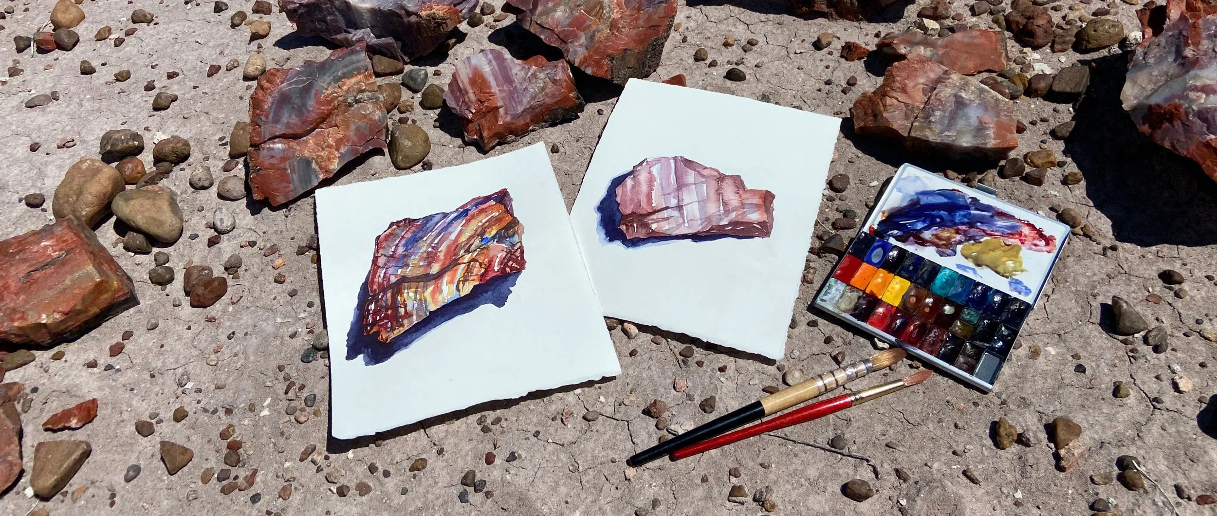 Observing and then learning to paint the petrified wood was a highlight of my residency. For the majority of my first week in the park it was too windy and hot to paint much outside except tiny sketches (95 deg F and 55 mph wind is simply too hard to paint in. It feels like a giant hairdryer is running at full blast, and my paper, paintbrushes, and even palette kept trying to fly away). So, I started hiking as early as I could, usually shortly after sunrise, and I planned routes that took me to new terrain and back before noon when the wind really picked up. This routine gave me time back in the historic residence to experiment with and troubleshoot how to paint the incredible patterns of petrified wood I saw earlier in the day.